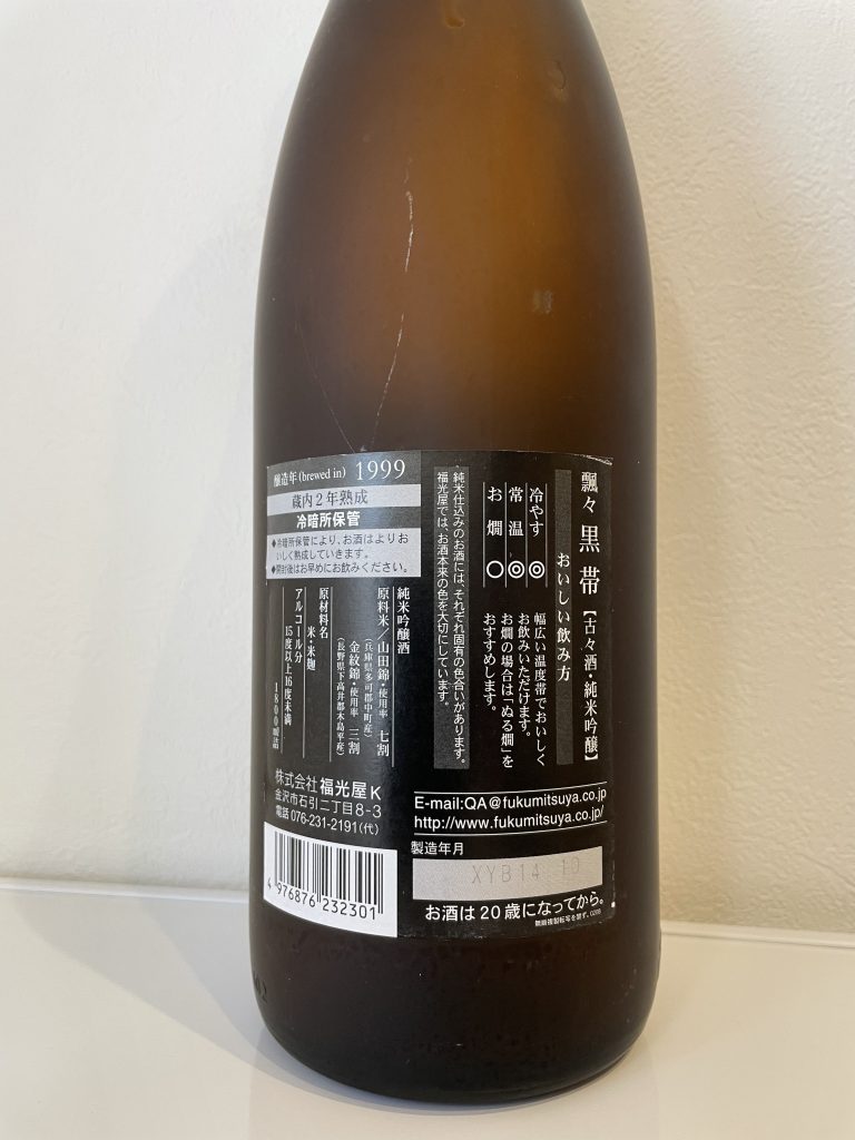 • 感想:1999年に醸造され、酒屋の冷蔵庫で熟成を続けた古酒。濃い黄色。まったくアルコールの刺々しさがなく、日本酒と言われなければ気付かないほどの変化が生じている。純米吟醸にも関わらず糖度が9.8%と非常に低く、醸造アルコールを加えている「富士大観 紫ラベル」や「びわこのくじら」に匹敵する糖度の低さになっている。吟醸香やフレッシュさも失われており、淡白な味わいに好みは分かれるだろう。熟成に興味をもったので、売れ残りの日本酒を探してみようかと思った。