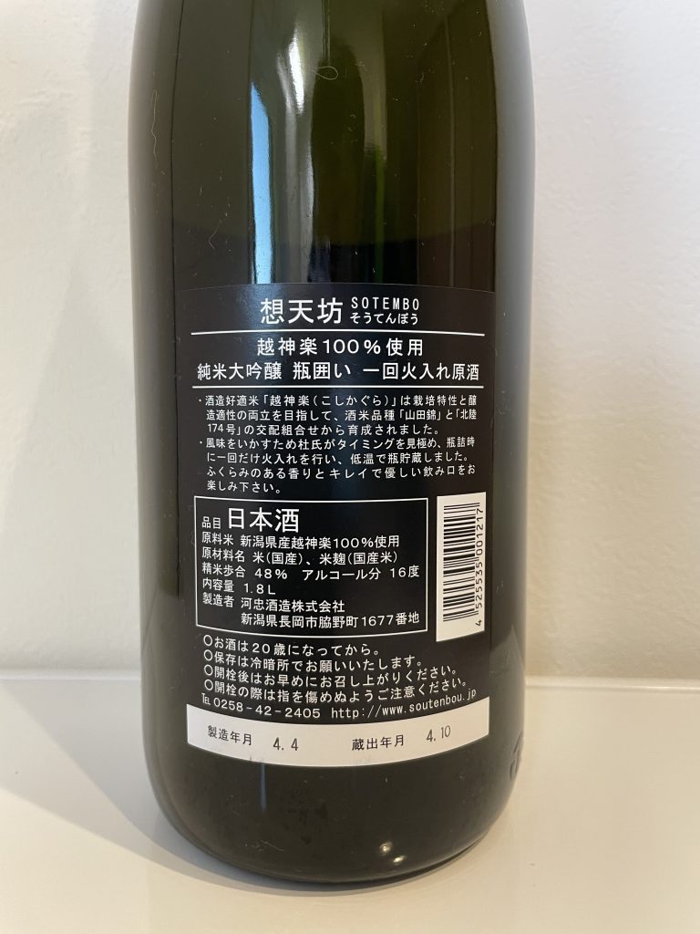 風味をいかすため杜氏がタイミングを見極め、瓶詰時に一回だけ火入れを行い、低温で瓶貯蔵しました。ふくらみのある香りとキレイで優しい飲み口をお楽しみ下さい。 - 感想:純米大吟醸らしいフルーツ香だが、火入れと半年間の熟成によってフレッシュ感が弱くなっている。辛口で食中酒には適しているが、純米大吟醸を期待して購入するのはやめたほうがよいだろう。