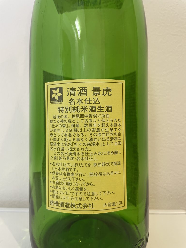 - ラベル情報:越後の国、栃尾西中野俣に所在 聖なる神の森として古来より伝えられた「杜々の森」。樹齢、数百年を超える巨木が原生し又50種以上の野鳥が生息する森として有名である。その原生巨木の合い間より絶える事なく湧きい出る清冽な湧清水は名水「杜々の森湧水」として全国名水百選に指定された。この名水湧清水を仕込み水に求め醸した酒「越乃景虎・名水仕込」。・名水仕込のしぼりたてを、季節限定で瓶詰した本生酒です。