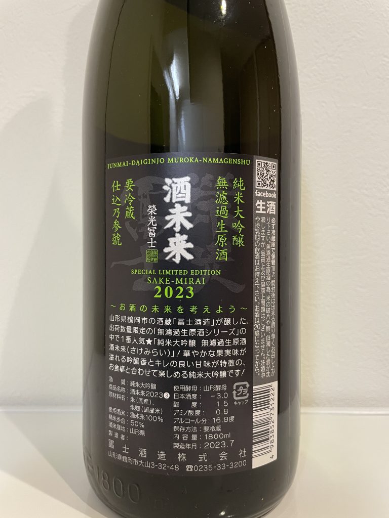 ~お酒の未来を考えよう~ 山形県鶴岡市の酒蔵「冨士酒造」が醸した、出荷数量限定の「無濾過生原酒シリーズ」の中で1番人気☆「純米大吟醸 無濾過生原酒 酒未来(さけみらい)」!華やかな果実味が溢れる吟醸香とキレの良い甘味が特徴の、お食事と合わせて楽しめる純米大吟醸です! - 感想:冷や。極薄い黄色。微炭酸。純米大吟醸を飲みたい時は栄光冨士を選ぶことが多い。ラベルの色やデザインが美しくて目を引く酒蔵。熟したメロンのような濃厚で甘い香りと、いかにも純米大吟醸という甘さだが、さすがに甘すぎるので食中酒よりはデザート酒に向いている。酸度とアミノ酸度まで公開しているのは珍しい。