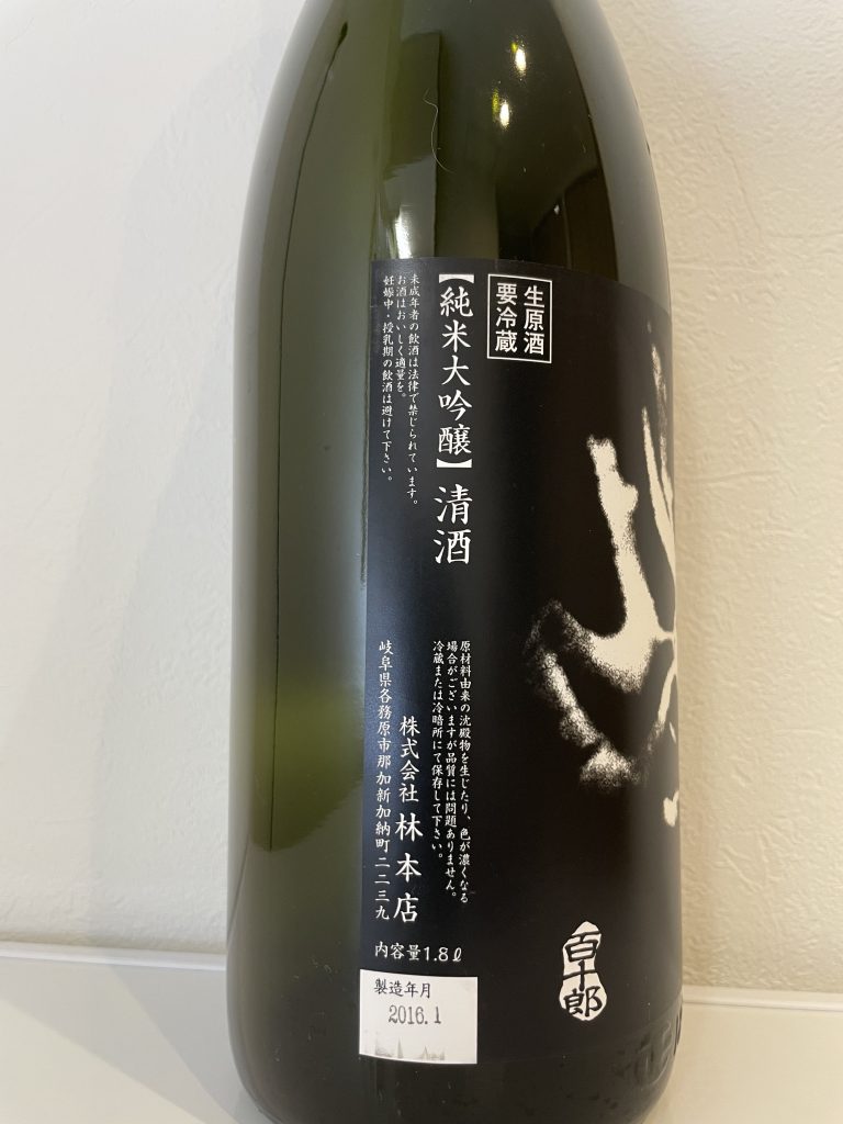 - 感想:冷や。濃い黄色。炭酸はなし。もしやと思ったが、「純米吟醸 無濾過生原酒 百十郎」と同様に2016年1月に製造されていた。公式サイトに載っている黒面とはラベルのデザインが異なっている。本来の味はわからないが、純米大吟醸のフレッシュさが弱くなっているので、熟成による影響だろう。前回のような強い生酛感がなく、ぼんやりとした味わい店になっている。純米大吟醸は熟成に不向きなのかもしれない。