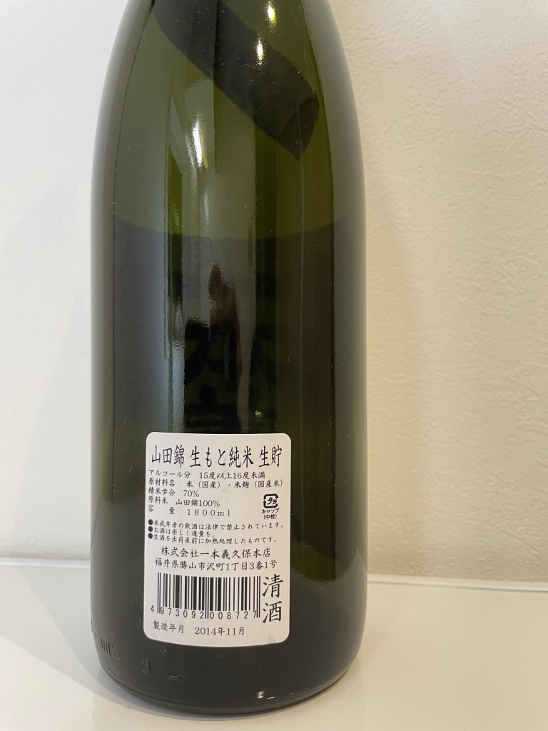 山田錦 生もと純米 生貯 - 感想:冷や。濃い黄色。生酛だが酸味とピリッとしたアルコール感でスッキリしており、吟醸香もなく食中酒に適している。これまでに紹介した酒の中では「酸基醴酛 乳酸発酵活性にごり」の次に酸度が高い。いかにも純米酒という感じ。製造年月が2014年11月のため公式サイトに載っていないが、世界で初めて清酒酵母として分離された由緒ある酵母を使っているとのこと。