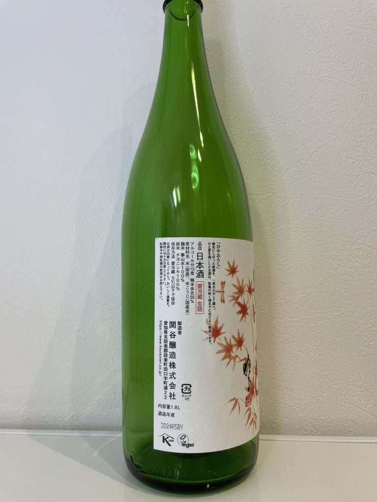 - ラベル情報:「ひやおろし」春先にしぼった新酒を、一度火入れして蔵へ。ひと夏を過ごしたお酒は、秋風の吹くころまでにほどよく熟成します。
