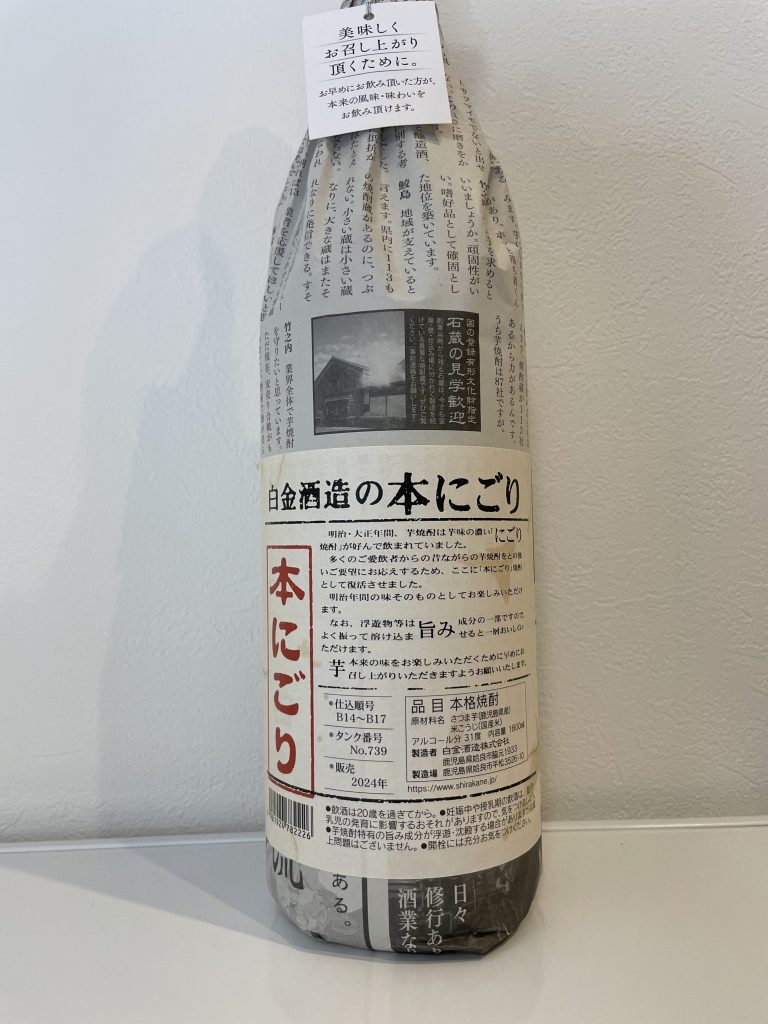 - ラベル情報:明治・大正年間、芋焼酎は芋味の濃い「にごり焼酎」が好んで飲まれていました。多くのご愛飲者からの昔ながらの芋焼酎をとの強いご要望にお応えするため、ここに「本にごり」焼酎として復活させました。明治年間の味そのものとしてお楽しみいただけます。なお、浮遊物等は旨味成分の一部ですので、よく振って溶け込ませると一層おいしくいただけます。芋本来の味をお楽しみいただくために早めにお召し上がりいただきますようお願いいたします。