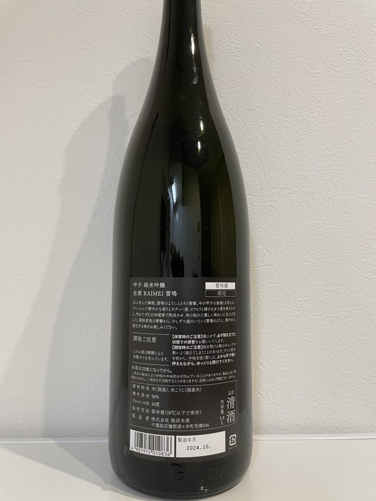 口に含んだ瞬間、雷鳴のようにとどろく衝撃。今の甲子の象徴とも言える、フレッシュで華やかな香りとボディー感、ピリピリと弾けるガス感を保ちながら、秋まで-5℃の冷蔵庫で熟成させ、角の取れた優しい味わいに仕上げました。開栓直後の衝撃から、少しずつ遠のいていく雷鳴のように、穏やかに変化する味をお楽しみください。 - 感想:冷や。僅かに炭酸の刺激がある。生酒らしいフレッシュさと無濾過によるしっかりしたコクがある。前回の「甲子 純米大吟醸 直汲み生原酒」と糖度がほとんど変わらず酸度がやや低いが、甘味と酸味のバランスが良いと感じるのは純米大吟醸と純米吟醸の違いによるのだろうか。ラベルに「雷鳴」という名前の由来が丁寧に記載されており、限定品としての酒蔵の思い入れを感じた。