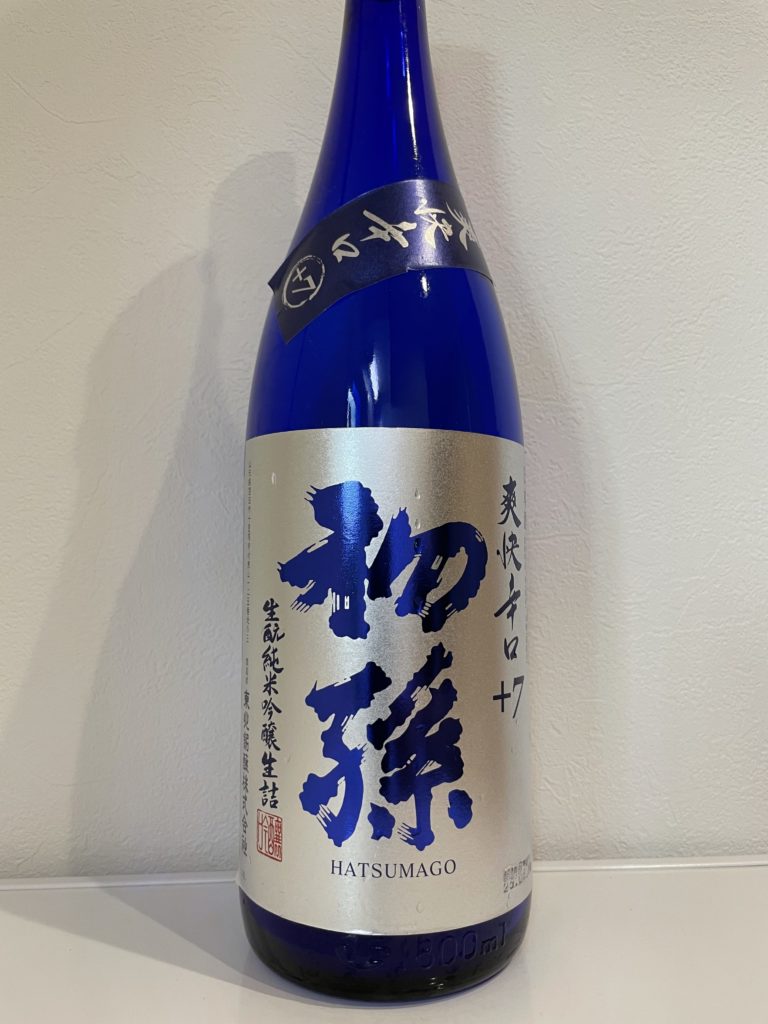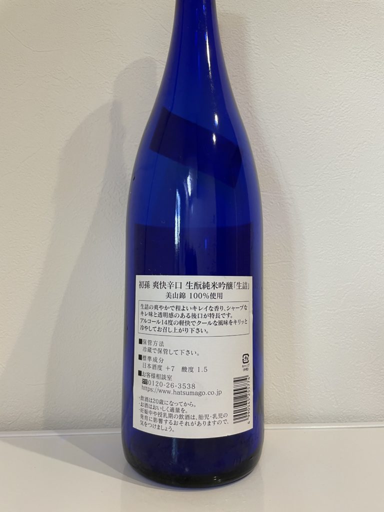 生詰の爽やかで程よいキレイな香り、シャープなキレ味と透明感のある後口が特徴です。アルコール14度の軽快でクールな風味をキリッと冷やしてお召し上がり下さい。 - 感想:冷や。炭酸はなし。公式サイトに載っていない限定品。鮮やかな青色の瓶と銀色のラベルが目を引く。ラベルによると日本酒度+7、酸度1.5で辛口のためか生酛にも関わらず色が透明に近い。糖度と酸度のいずれも低く、水のようにさっぱりしているので油っこい料理に合いそうだが、そのまま飲むには物足りなさを感じた。