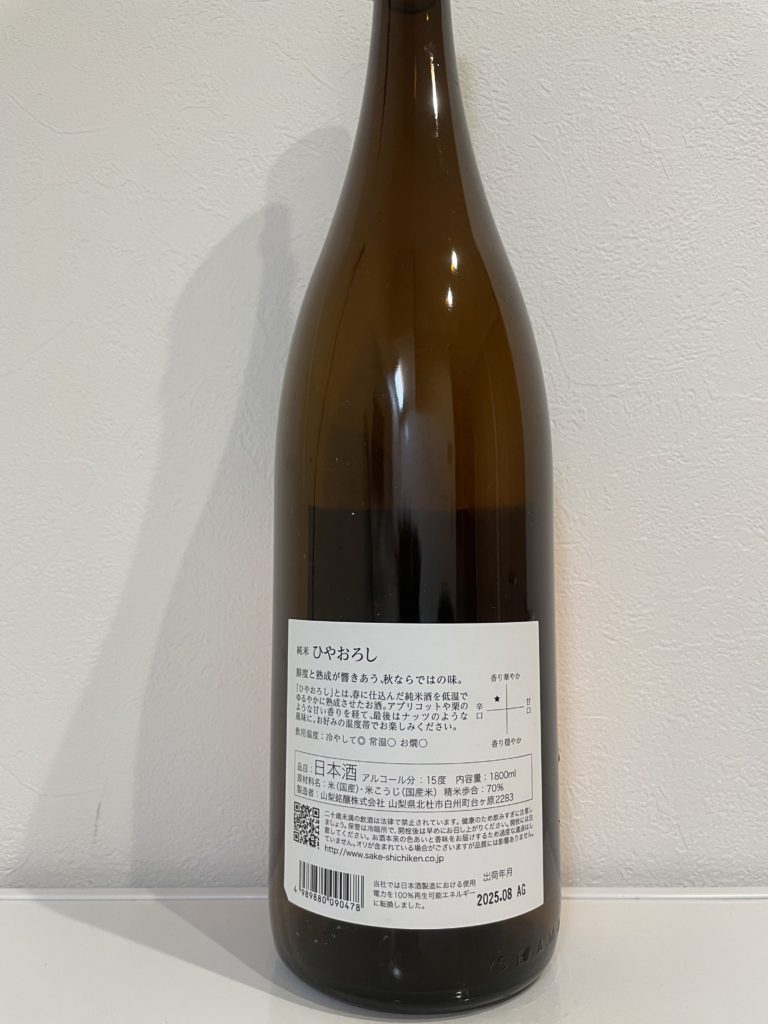「ひやおろし」とは、春に仕込んだ純米酒を低温でゆるやかに熟成させたお酒。アプリコットや栗のような甘い香りを経て、最後はナッツのような風味に。お好みの温度帯でお楽しみください。 - 感想:冷や。炭酸はなし。純米酒のひやおろしにも関わらず、フルーツのような吟醸香と純米大吟醸に似たスッキリした甘さが特徴的。珍しいオレンジ色のラベルに記載の通り、アプリコットのような香りを感じる。酸度が1.75%と低いので、相対的に甘味を強めに感じるのだと思う。