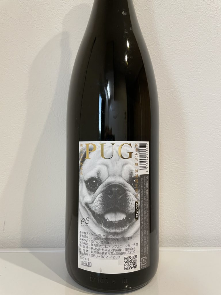 - 感想:冷や。炭酸あり。百十郎で有名な林本店だが、こちらはパグのラベルがインパクト強すぎ。公式サイトに情報がなく限定酒らしい。純米大吟醸の無濾過生原酒の中では糖度も酸度も平均的だが、炭酸の爽やかな刺激でグビグビ飲んでしまう。